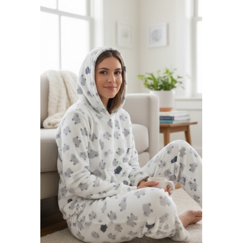 Made from ultra-soft coral fleece, this set features a hoodie-style top and matching pants with an all-over snowflake pattern.