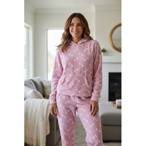 Made from ultra-soft coral fleece, this set features a hoodie-style top and matching pants with an all-over snowflake pattern.